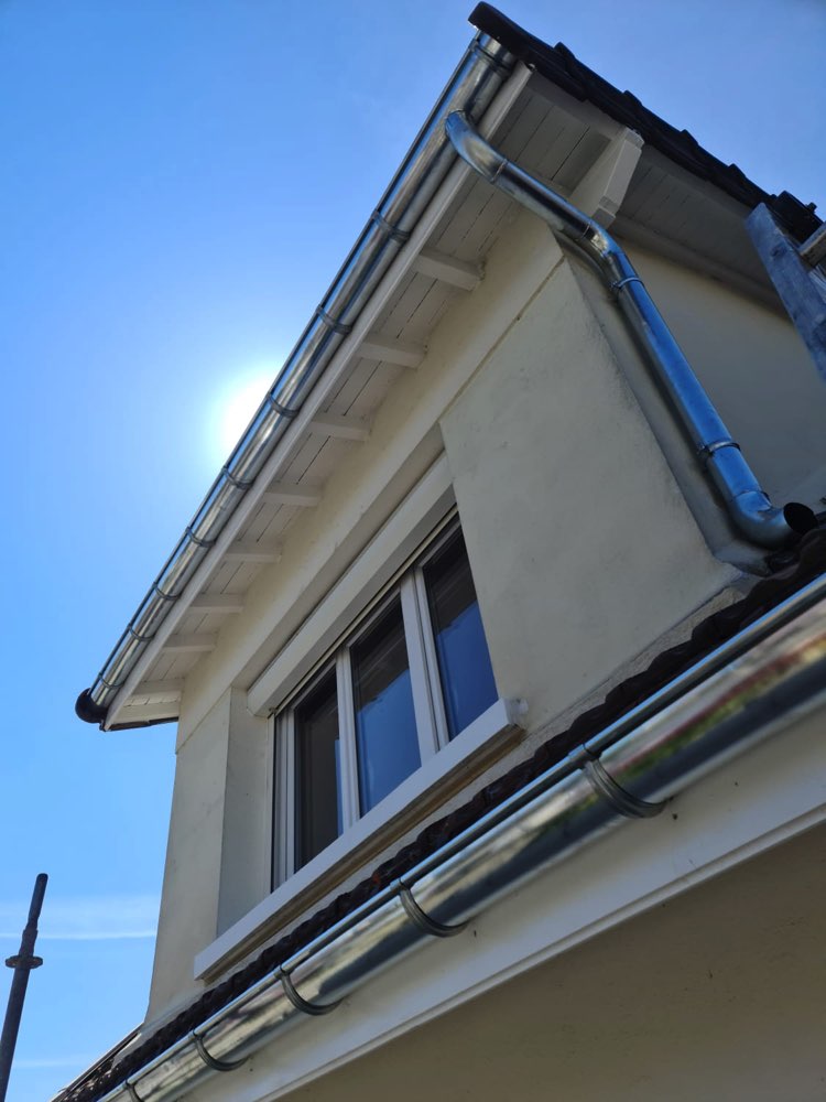 Des planches de rives fraîchement peintes ont été installées avec précision sur les chevrons, tandis que des crochets de gouttières en zinc naturel ont été fixés. L’ensemble des gouttières a été méticuleusement préparé au sol avant d’être soudé et installé.