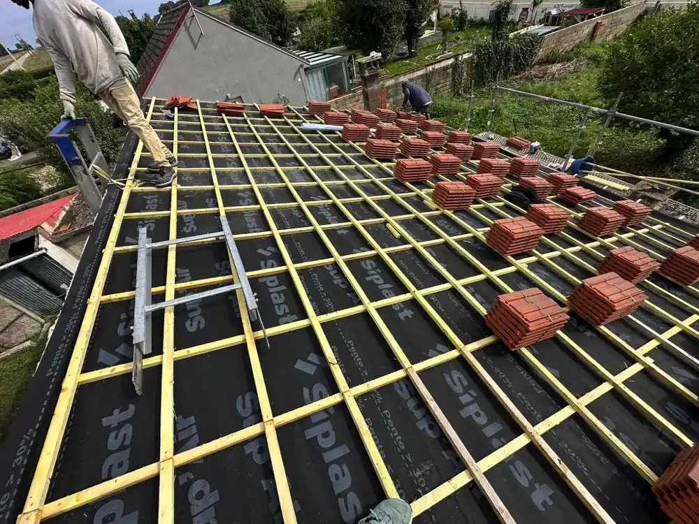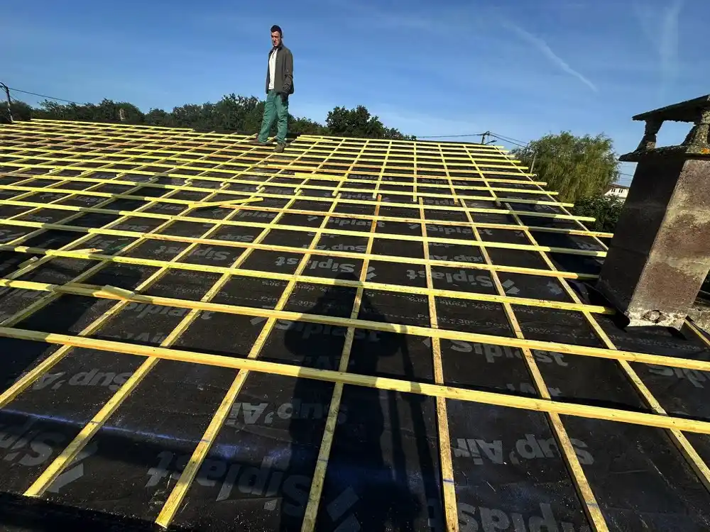 Des liteaux horizontaux et verticaux ont été installés à la place des anciens liteaux, friables évidemment, à cela, s’est ajouté la mise en œuvre d’un écran de sous toiture HPV.