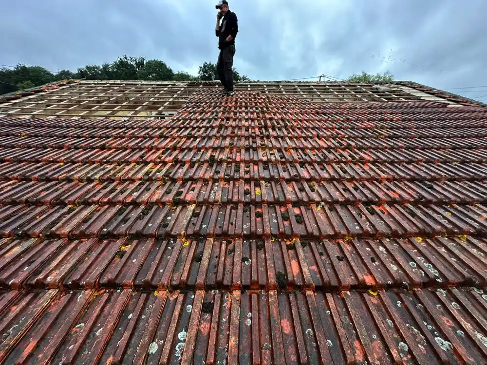 À la demande du client chez qui nous sommes déjà intervenus sur une réfection de toiture, nous avons posé un diagnostic sur l’état de celle-ci la toiture à notre arrivée en maculée de mousse, les tuiles perforées. Honnêtement aucune possibilité de restauration partielle.